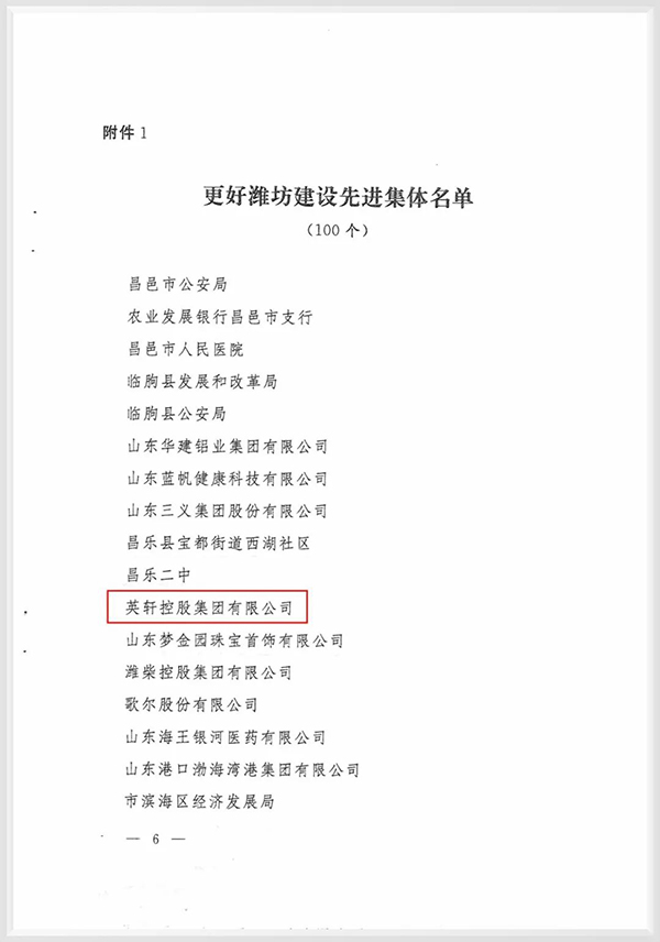 近日,中共潍坊市委、潍坊市人民政府召开全市工作动员大会,会议对在“更好潍坊”建设中表现突出的先进集体和个人进行表彰。英轩控股集团有限公司凭借卓越的业绩表现、锐意进取的拼搏精神以及在社会贡献中的突出担当,获评“更好潍坊建设先进集体”。