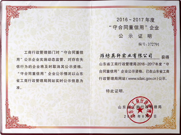 近日,昌乐县市场监管局召开了2016-2017年度山东省“守合同重信用”公示企业颁证暨信用建设经验交流会议。会上,公司领取了2016-2017年度“守合同重信用”企业公示证明。