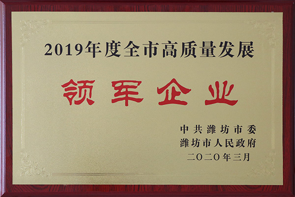 近日,潍坊市委、市政府颁布了“2019年度全市高质量发展领军企业”名单,我公司继2018年后再获此殊荣。
