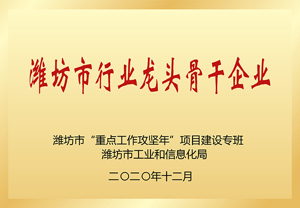 近日,潍坊市“重点工作攻坚年”项目建设专班、潍坊市工业和信息化局联合下发了《关于公布潍坊市第二批行业龙头骨干企业培育名单的通知》,我公司荣获潍坊市行业龙头骨干企业荣誉称号。