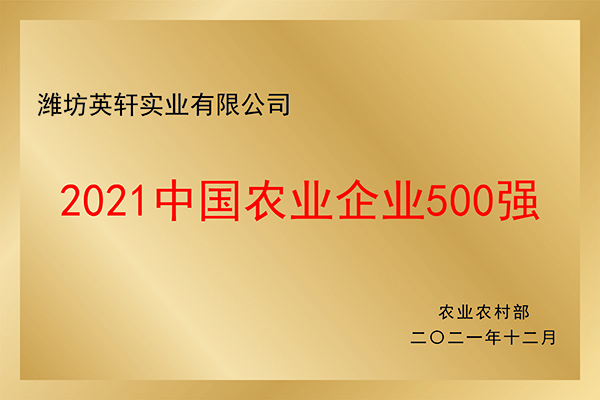 近日,国家农业农村部组织了第五届《中国农业企业500强》评选活动,潍坊英轩实业有限公司凭借过硬的综合实力成功入选。该评选参照国际通行评价办法,由企业按照要求进行申报,经材料审核、专家评议等程序最终确定入选企业。