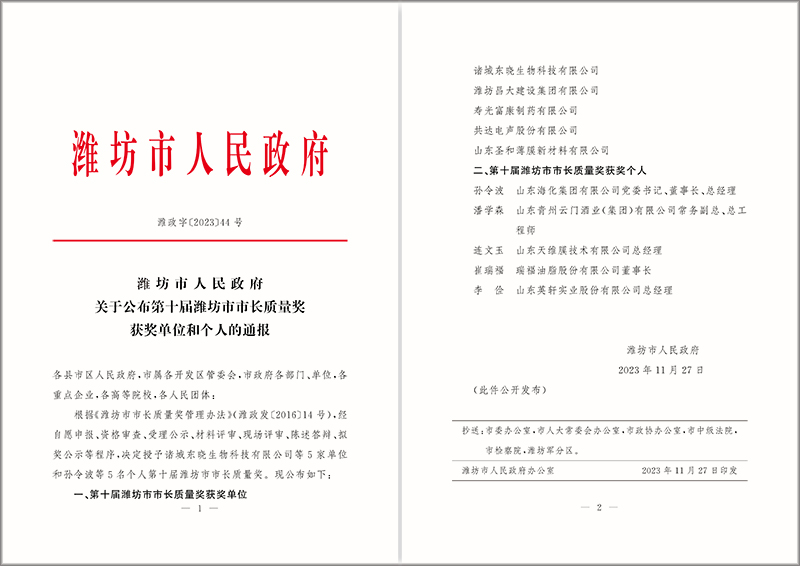 2023年11月27日,潍坊市人民政府公布第十届潍坊市市长质量奖获奖单位和个人的通报,公司总经理李俭获“第十届潍坊市市长质量奖”。