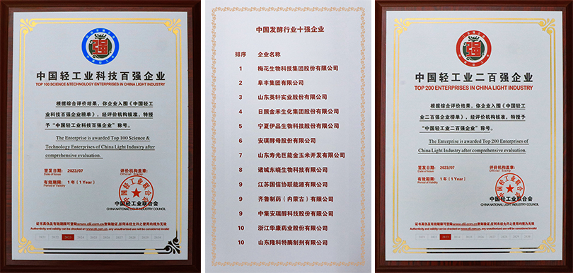 On July 20, 2023, top hundreds enterprises of light industry summit forum on "Becoming a world-class enterprise and serving the people beautiful life" was held in Beijing. Ensign Industry was awarded as "TOP 200 ENTERPRISES IN CHINA LIGHT INDUSTRY"、"TOP 100 SCIENCE & TECHNOLOGY ENTERPRISES IN CHINA LIGHT INDUSTRY " and "TOP 10 ENTERPRISES IN CHINA FERMENTATION INDUSTRY ".
